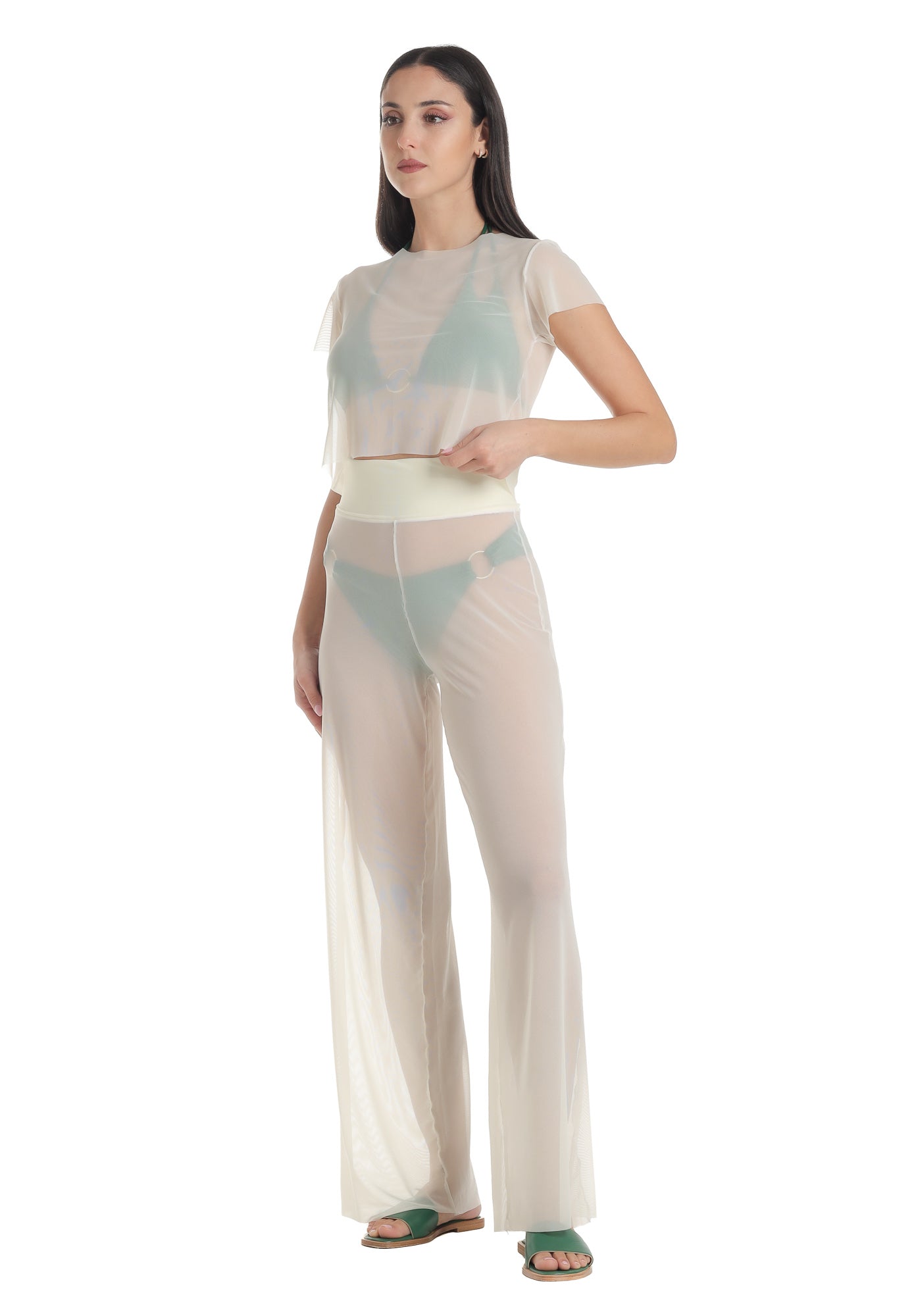 Completo pantalone a vita alta e maglia a girocollo made in Italy in tessuto elastico con leggera trasparenza.