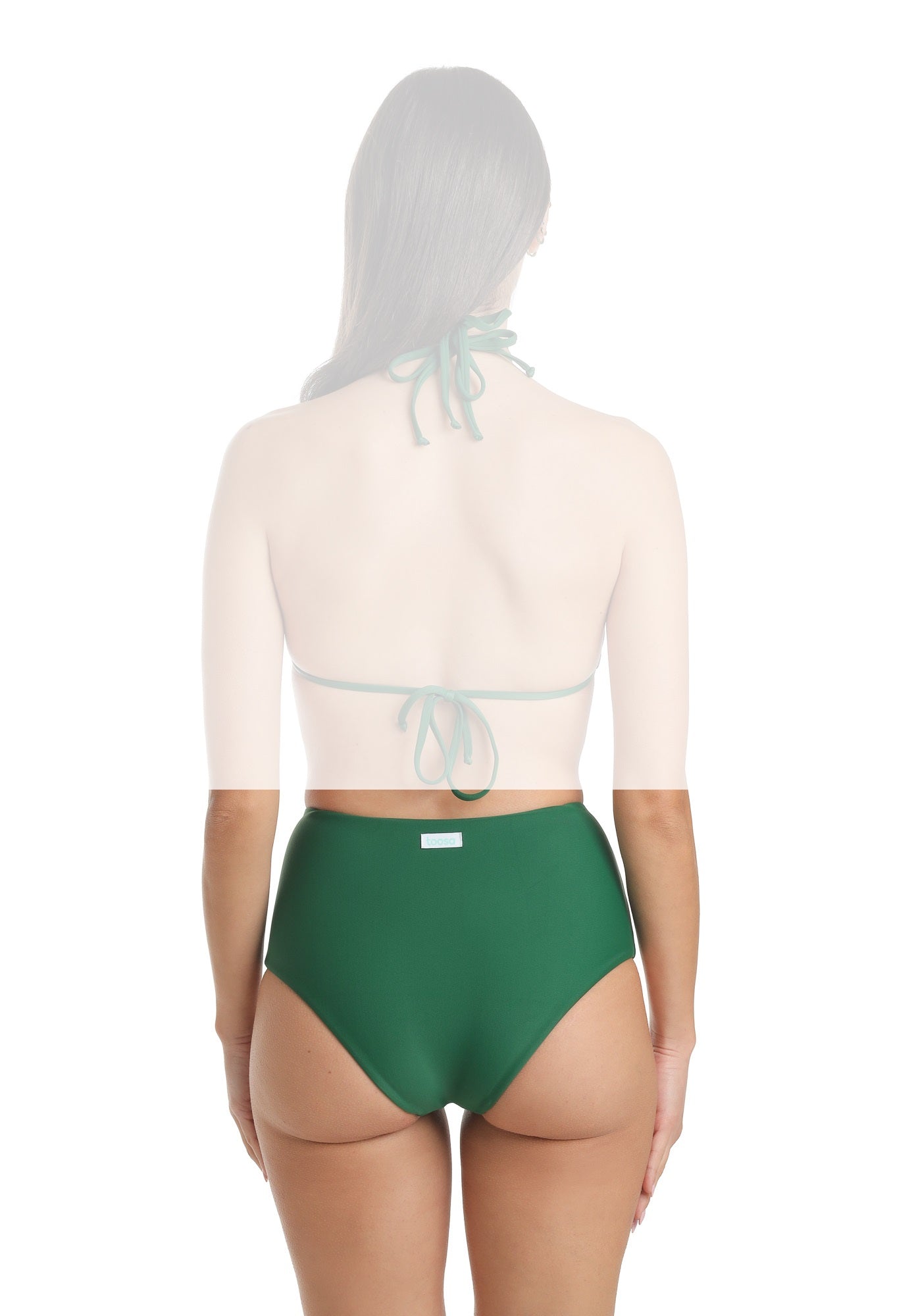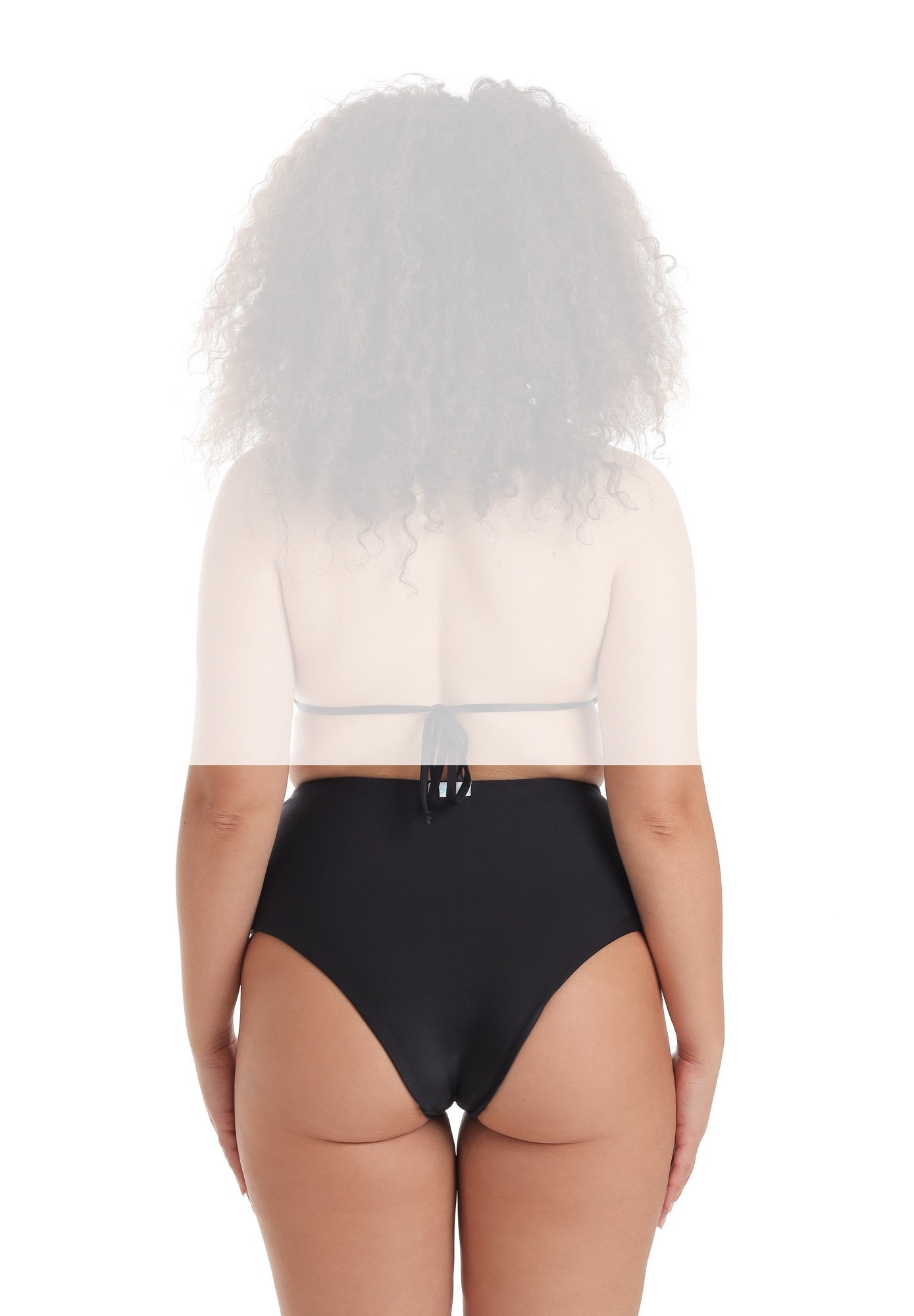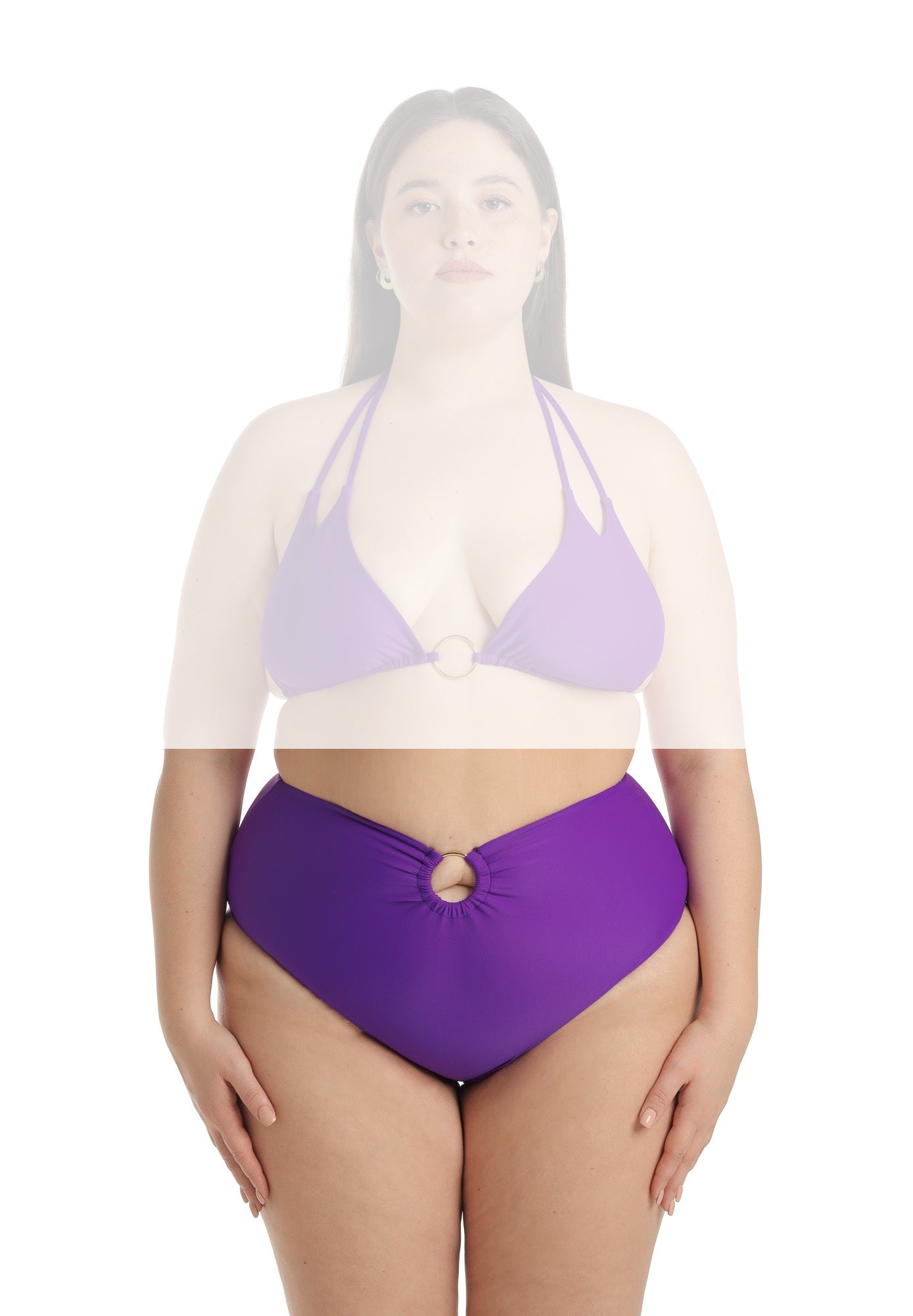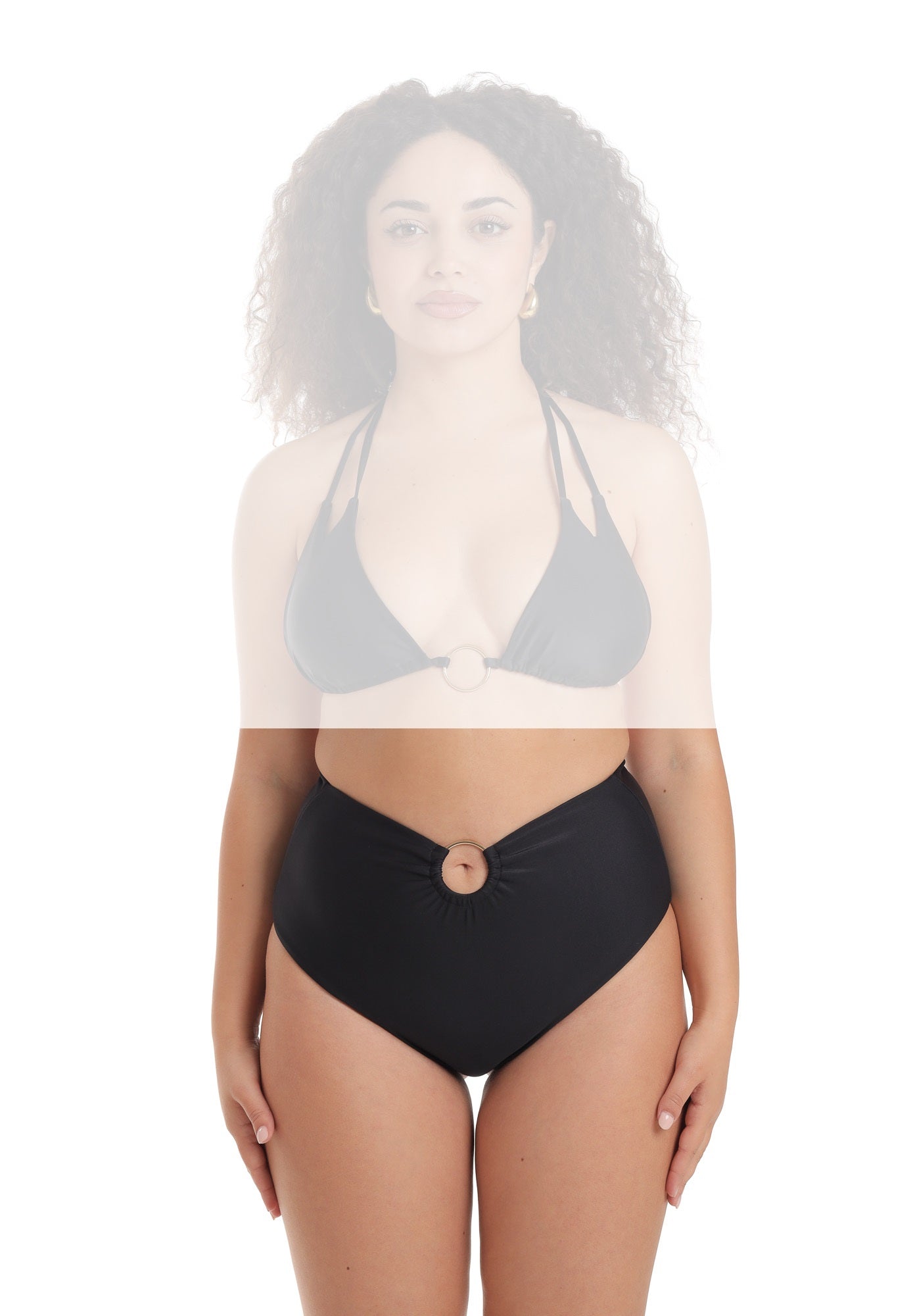 Slip a vita alta con una leggera forma a V sul davanti che culmina al centro nella presenza di un anello in zama a richiamare quello dei top Asia ed Iris. Il taglio è a brasiliana.